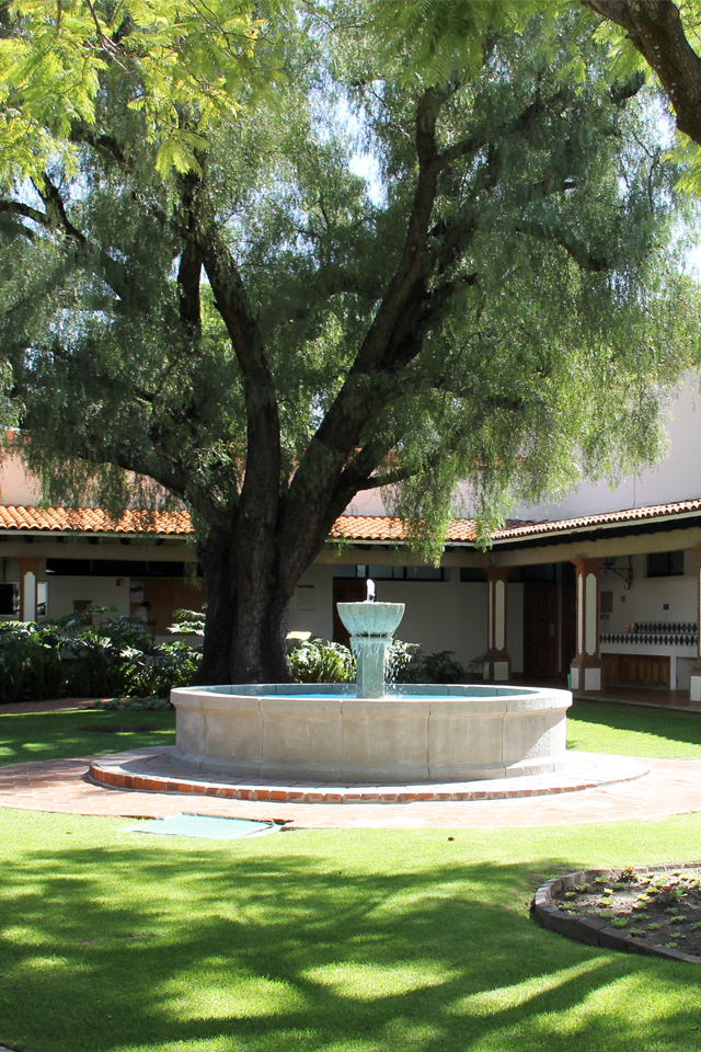 It begins in the southern campus access (José Gaos College). The mix of cedars and bougainvillea frame a collection of Talavera urns along this path.